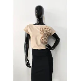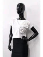 Dodaj do swojej garderoby nutę elegancji i kobiecego uroku dzięki tej wyjątkowej bluzce damskiej z krótkim rękawem. Jej klasyczny krój z nowoczesnym akcentem – wywijany rękaw i wydłużony, lekko zaokrąglony tył – sprawia, że idealnie sprawdzi się zarówno na co dzień, jak i w bardziej formalnych stylizacjach. Prawdziwą ozdobą są przestrzenne kwiaty 3D, które nadają całości modnego i oryginalnego charakteru. Wykonana z miękkiej, oddychającej bawełny z dodatkiem elastanu, gwarantuje komfort noszenia i dopasowanie do sylwetki.