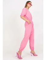 Letní overal na knoflíky. Kombinéza má krátké rukávy zakončené volánkem, v pase pružný záhyb a na bocích kapsy.