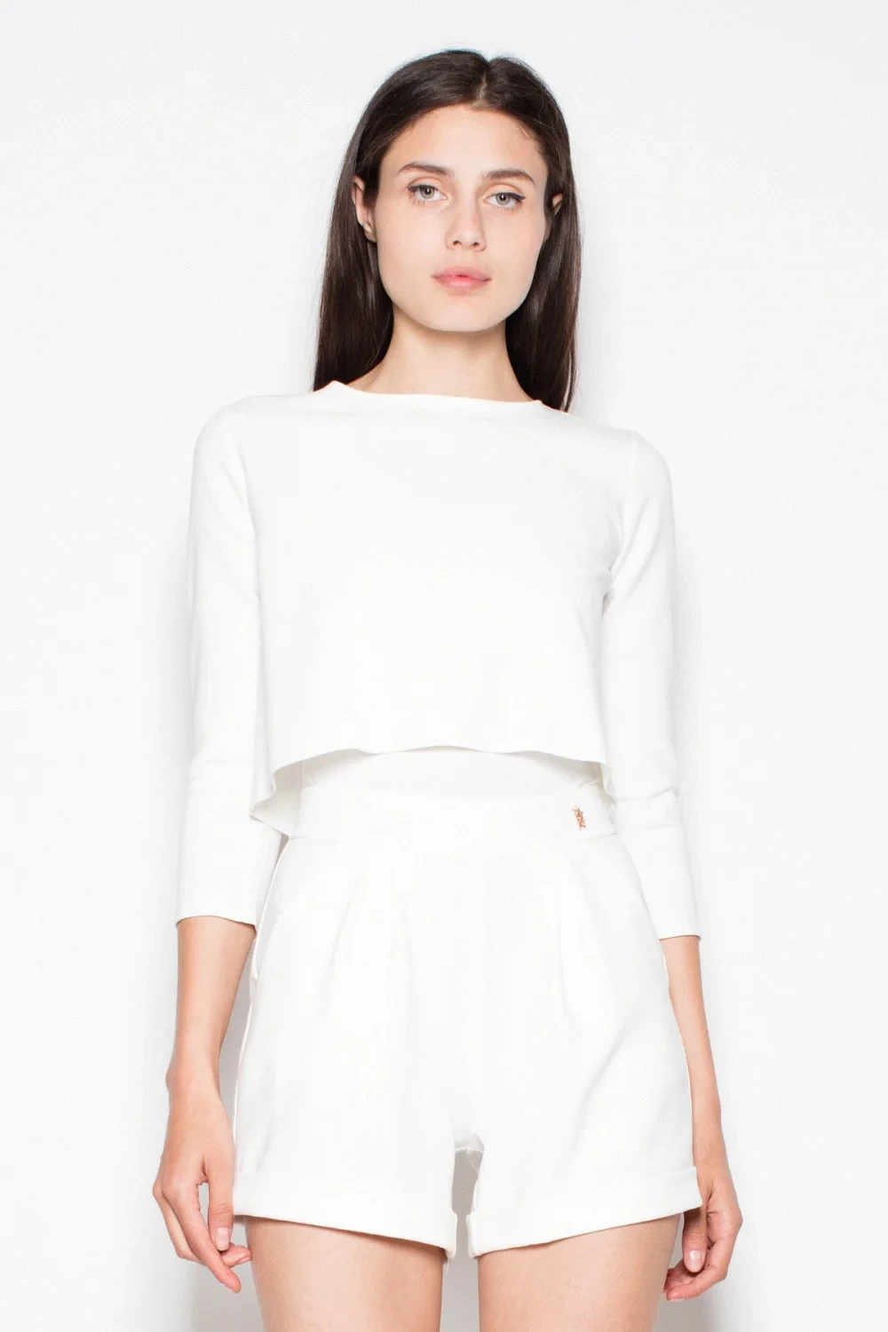 Elegantní dvouvrstvý overal s krátkými šortkami bez ramínek. Top má dlouhé rukávy, obléká se zepředu a vzadu se zapíná na háček. Model s originálním střihem.