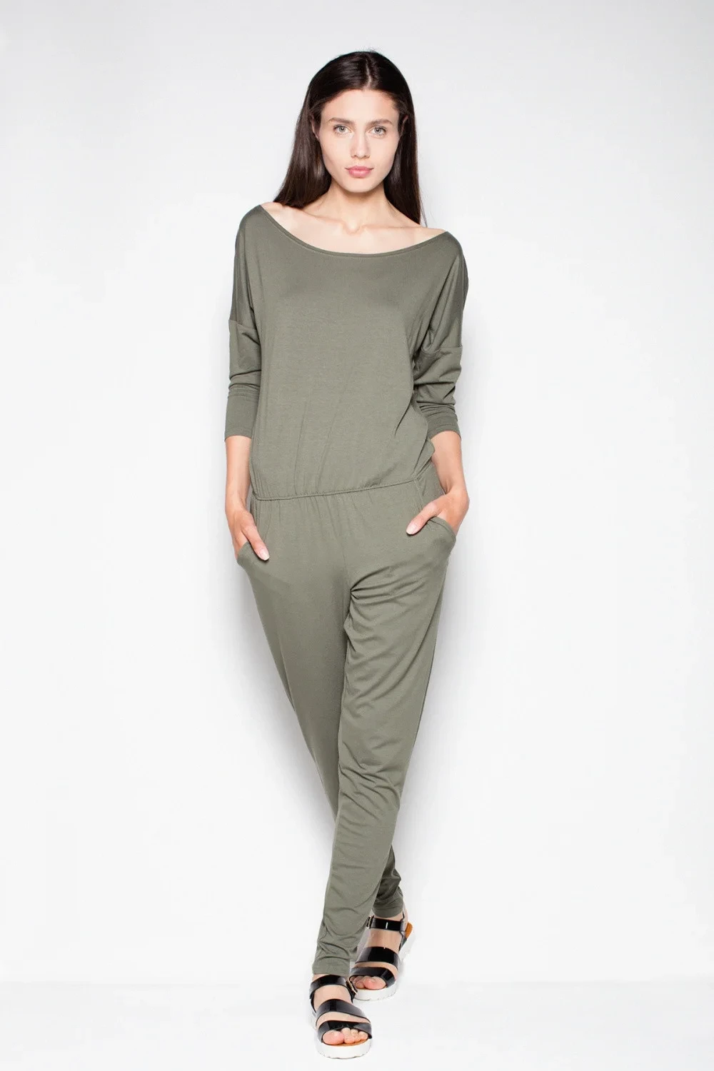 Sportovní kombinéza s půlkruhovým výstřihem a spadlými rukávy, v pase přestřižená. Klasický střih.