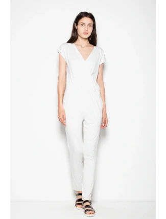 Sportovní kombinéza s krátkými rukávy a dlouhými zúženými nohavicemi. Model je zakončen efektním obálkovým výstřihem a šňůrkou v pase zdůrazňující siluetu.
