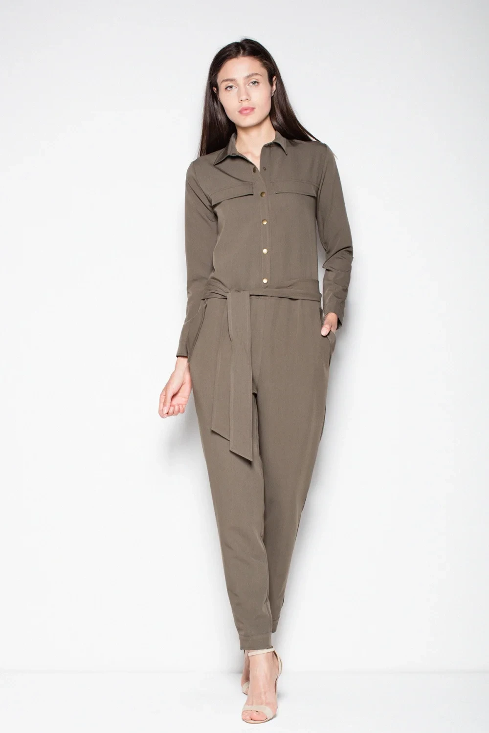 Elegantní kombinéza s dlouhými rukávy a dlouhými nohavicemi s límečkem. Model je zakončen efektním zavazováním v pase.