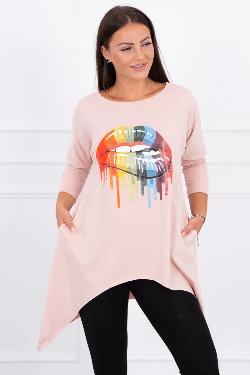 Představujeme vám super oversize halenku. Blůza má na přední straně potisk zobrazující rty v barvách duhy. Halenka s kapsami. Tato halenka se vyznačuje módním designem a precizním zpracováním. Ve vašem šatníku rozhodně nesmí chybět. Halenka je vyrobena z vysoce kvalitního materiálu. Univerzální velikost je vhodná pro dámy, které nosí každodenní oblečení ve velikostech M, L nebo XL