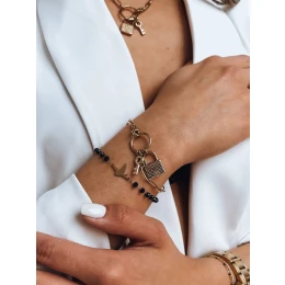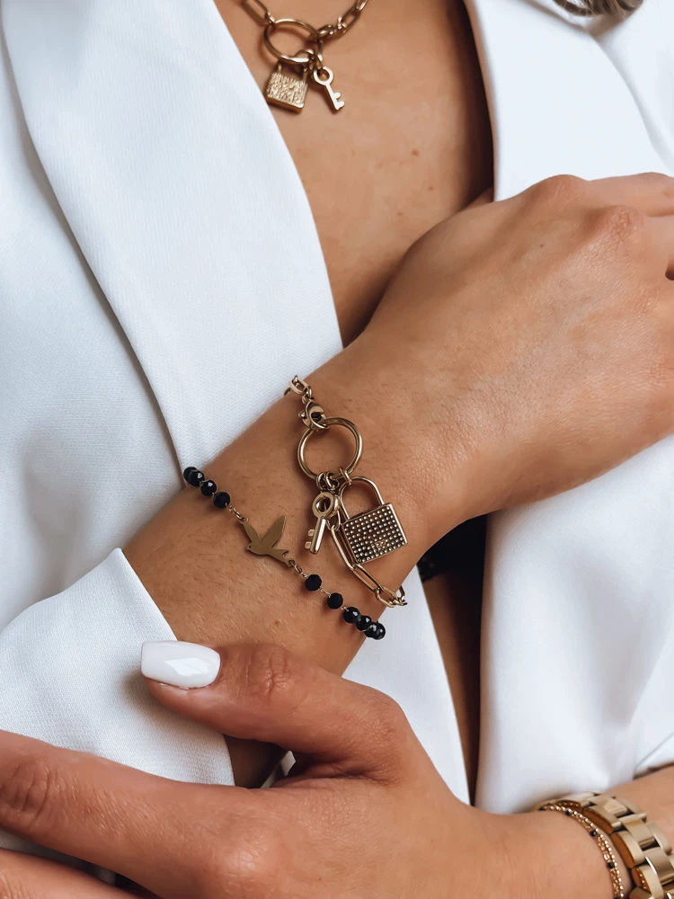 Náramek s motivem holuba.Model má černé kuličky spojené zlatým řetízkem a celek je zakončen přívěskem ve tvaru holuba.Náramek je mimořádně stylový.