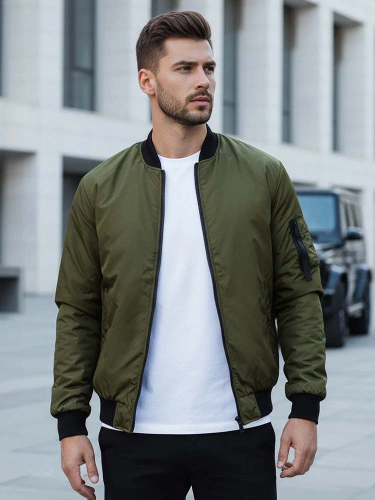 - Pro trochu formálnější styl: Bundu bomber zkombinujte s černým rolákem, tmavými chinos kalhotami a koženými mokasínami, abyste dosáhli kombinace klasiky a moderny.