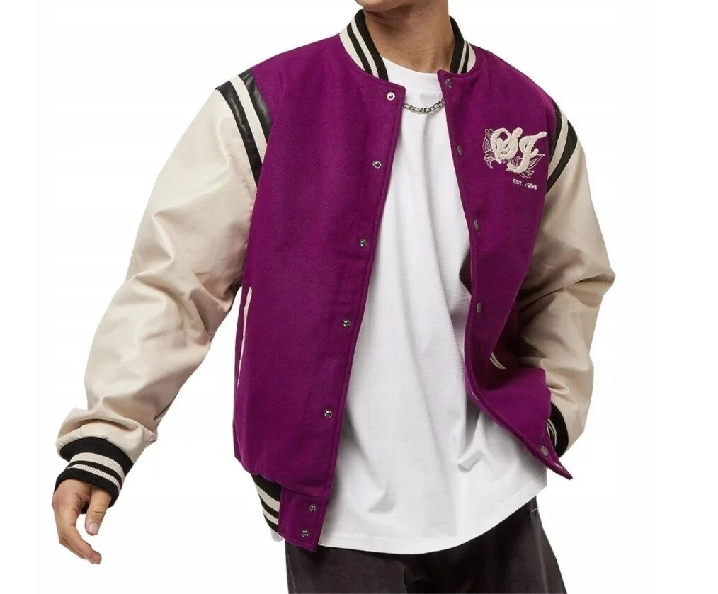 Pánská tříbarevná bunda s nápisem na zádech a nálepkou na prsou.