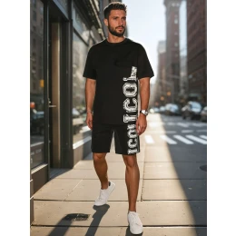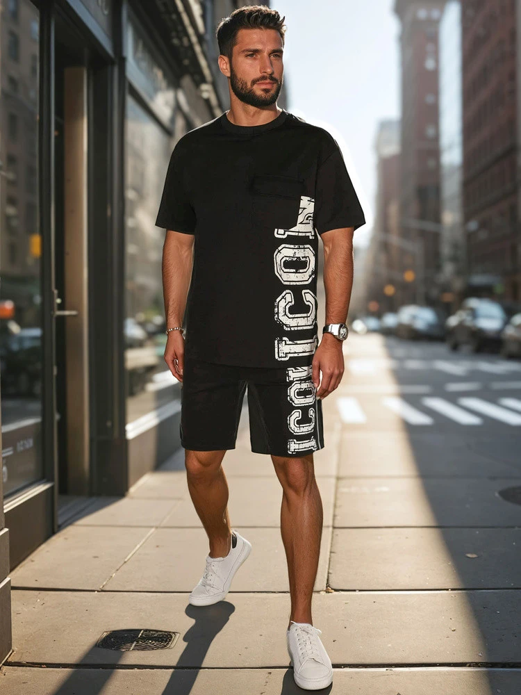 Pánská tepláková souprava sestávající z trička a šortek je moderní volbou pro příznivce pohodlného stylu. Tričko má originální potisk s nápisem "ICON" a kapsu s klopou, zatímco šortky mají elastický pas se stahovací šňůrkou a zipy v kapsách. Celá souprava je ideální pro městský styling v teplých jarních dnech.