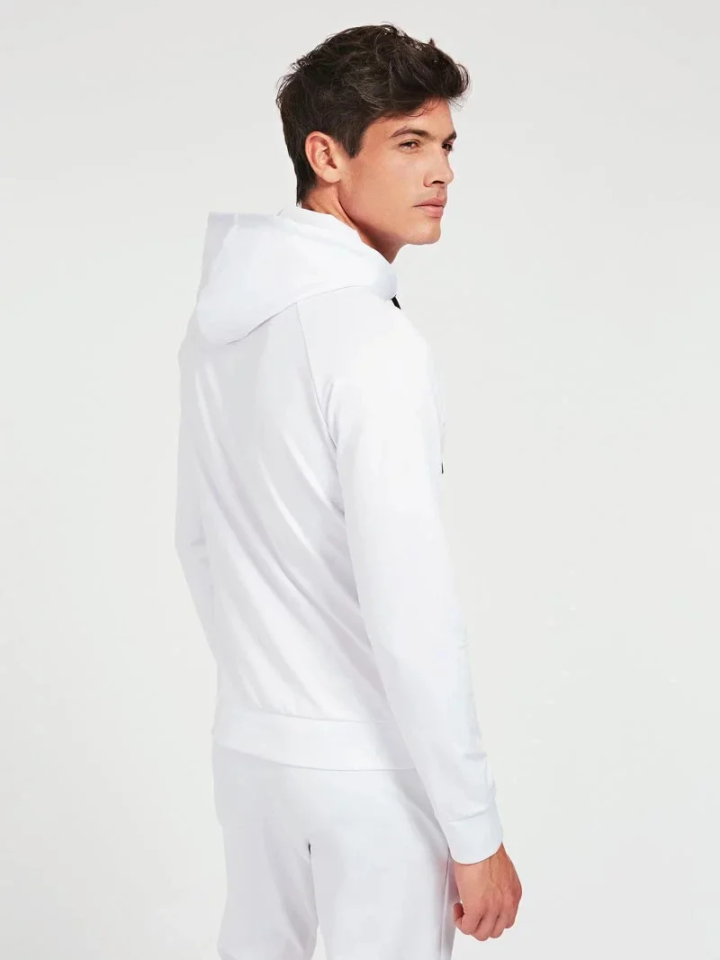 Stylová pánská mikina v bílé barvě na zip s kapucí a logem na přední straně.