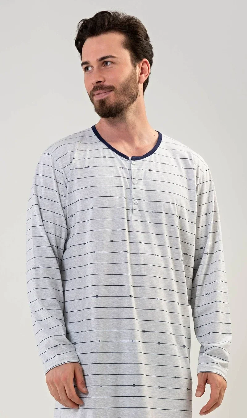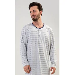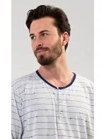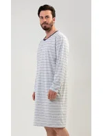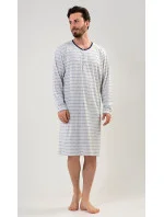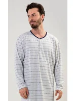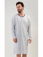 Pánská noční košile s dlouhým rukávem Flip. Pánská noční košile s dlouhým rukávem je určena pro všechny milovníky pohodlí. Košile má výstřih zakončený légou s knoflíčky. Výstřih a potisk v podobě proužků je v kontrastní tmavě modré barvě. Použitý materiál je příjemný a poddajný na dotek.