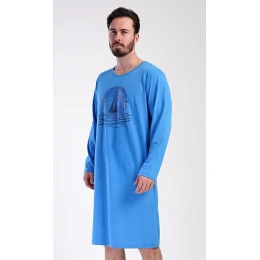 Pánská bavlněná noční košile s dlouhým rukávem Jachting. Jednobarevná pánská noční košile s kulatým výstřihem a délkou po kolena má na hrudi obrázek plachetnice a nápis 'Cape of good hope'. Noční košile je vhodným dárkem pro všechny milovníky moře a dálek. Použitý materiál s obsahem bavlny 100% je příjemný a poddajný na dotek.