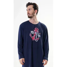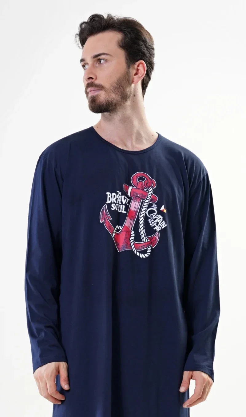 Pánská bavlněná noční košile s dlouhým rukávem Kotva. Pánská noční košile s dlouhým rukávem má na hrudi výrazný obrázek kotvy. Použitý bavlněný materiál je příjemný a poddajný na dotek.