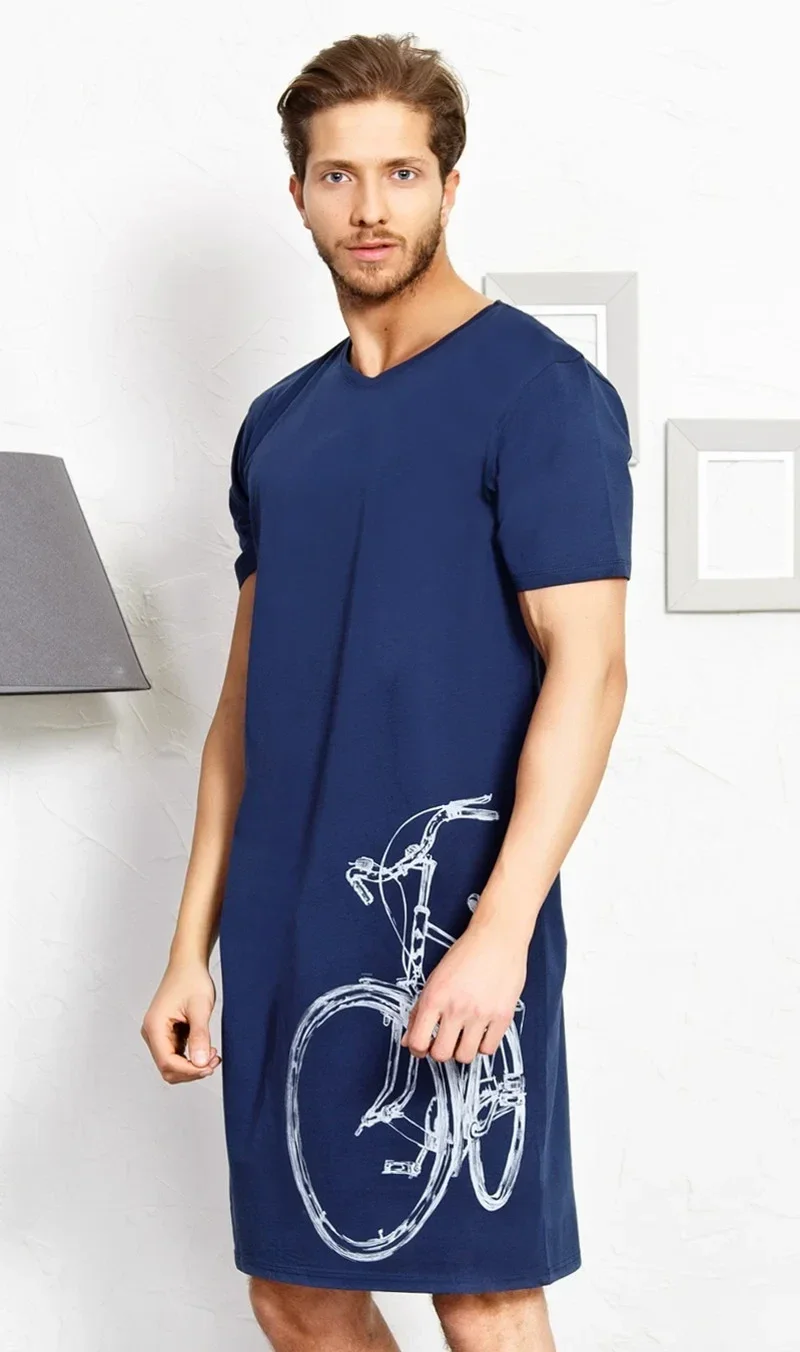 Pánská bavlněná noční košile s krátkým rukávem Bicykl. Jednobarevná pánská noční košile s kulatým výstřihem je zdobena velkým obrázkem jízdního kola. Tato košile je vhodným dárkem pro všechny cyklisty. Použitý materiál je jemný a poddajný na dotek. Obsah bavlny je 100%, pouze u světle šedé barvy 70%.