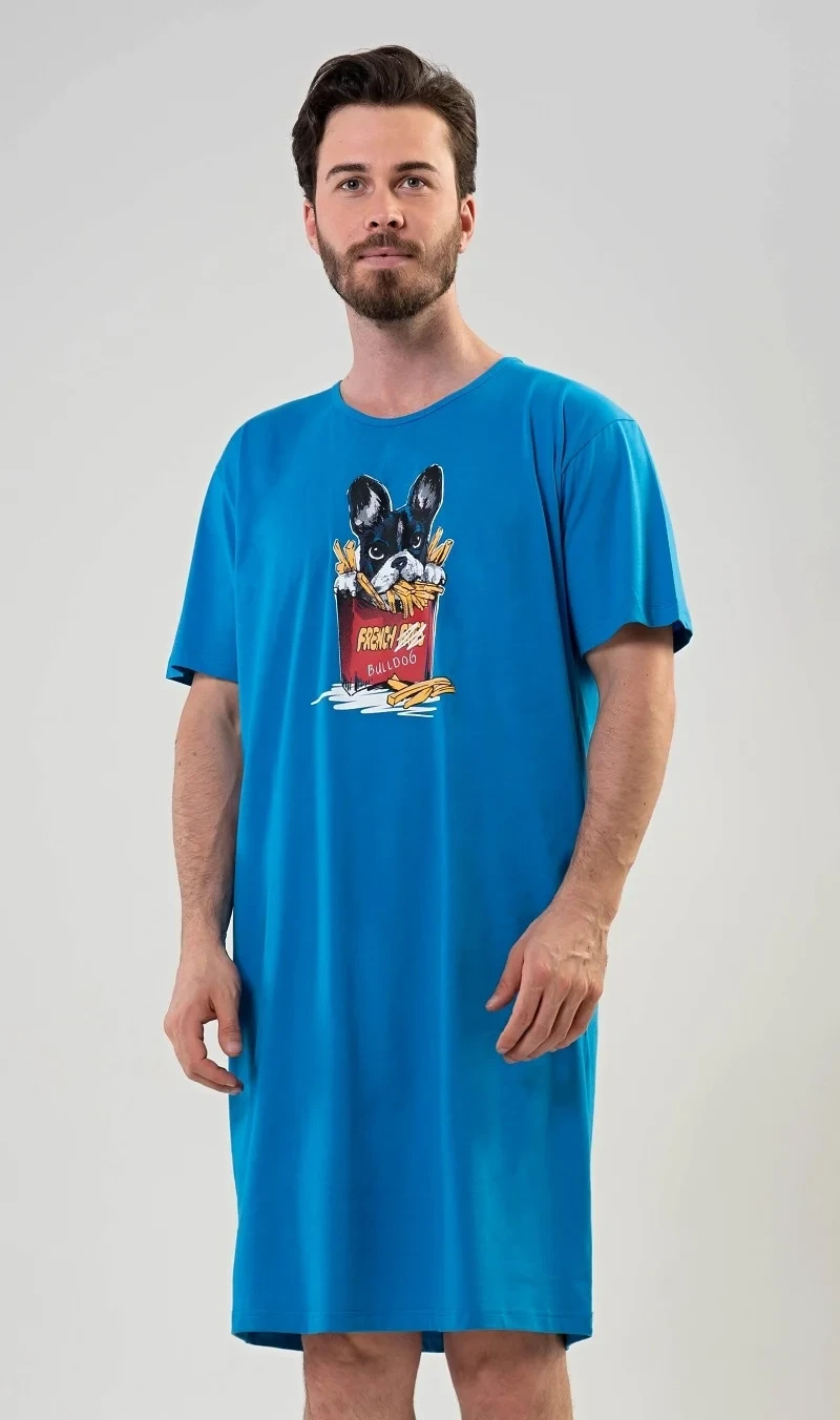 Pánská noční košile s krátkým rukávem Bulldog. Pánská noční košile s obrázkem Bulldoga v hranolkách je určena pro všechny milovníky pohodlí. Použitý materiál je jemný a poddajný na dotek. Obsah bavlny je 100%.