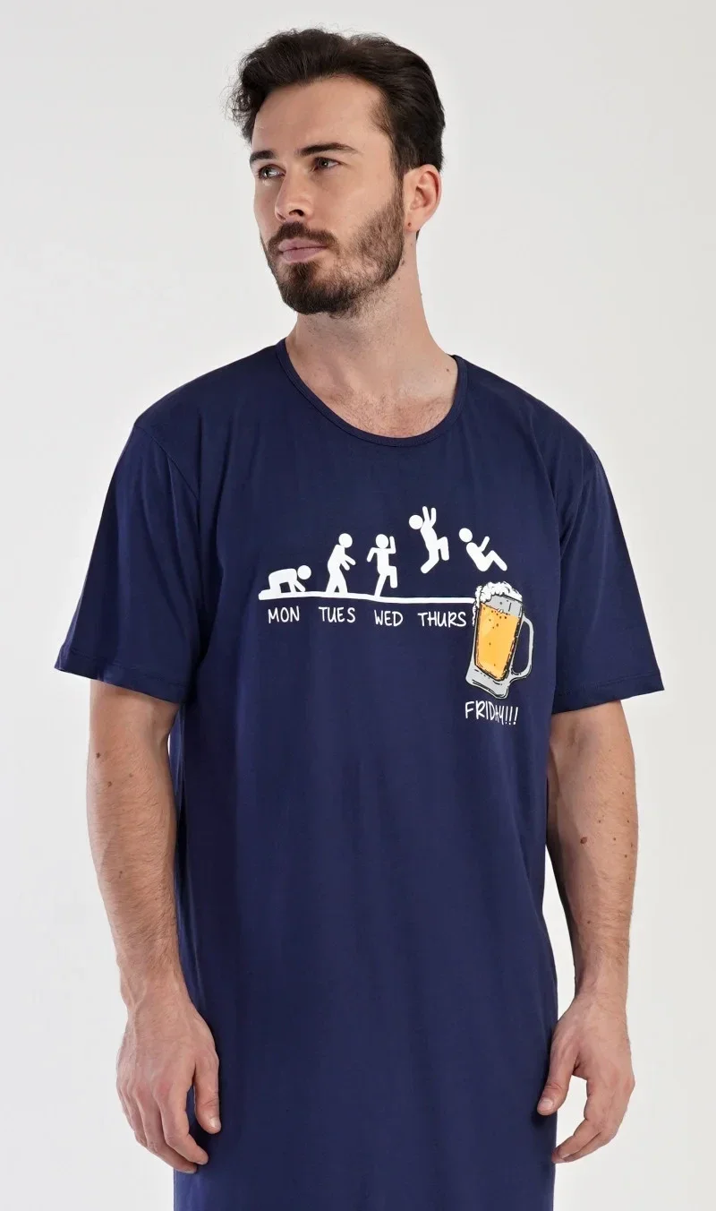 Pánská bavlněná noční košile s krátkým rukávem Filip. Jednobarevná pánská noční košile s kulatým výstřihem je zdobena veselým motivem. Obrázkem panáčků, kteří se s blížícím víkendem nemůžou dočkat sklenice piva. Použitý materiál je jemný a poddajný na dotek. Obsah bavlny je 100%.