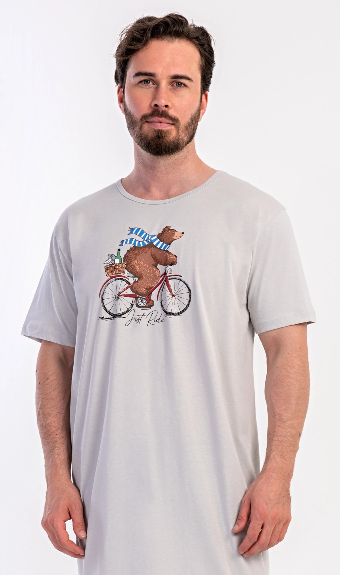 Pánská bavlněná noční košile s krátkým rukávem Méďa na kole. Jednobarevná pánská noční košile s kulatým výstřihem a délkou po kolena má na hrudi obrázek medvěda na kole a nápis 'Just ride'. Použitý materiál s obsahem bavlny 100% je příjemný a poddajný na dotek.