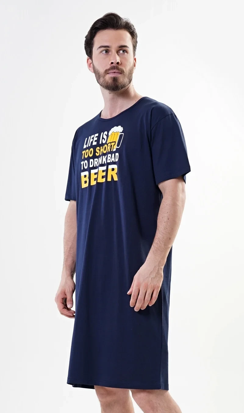 Pánská bavlněná noční košile s krátkým rukávem Petr. Pánská noční košile pro milovníky pohodlí je jednobarevná, na hrudi ji zdobí nápis 'Life is too short to drink bad beer', doplněný malým obrázkem půllitru. Použitý bavlněný materiál je příjemný a poddajný na dotek.