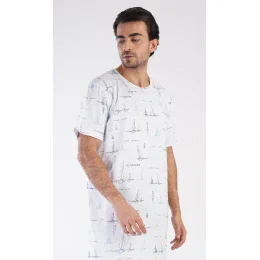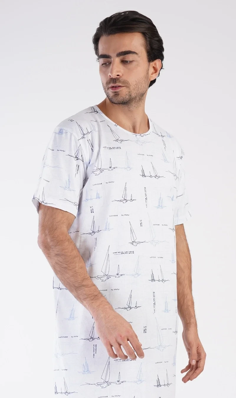 Pánská bavlněná noční košile s krátkým rukávem Plachetnice. Jednobarevná pánská noční košile s kulatým výstřihem je zdobena obrázky plachetnic a drobnými nápisy. Tato košile je vhodným dárkem pro všechny milovníky moře a dálek. Použitý materiál je příjemný a poddajný na dotek. Obsah bavlny je 100%.