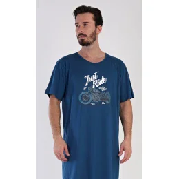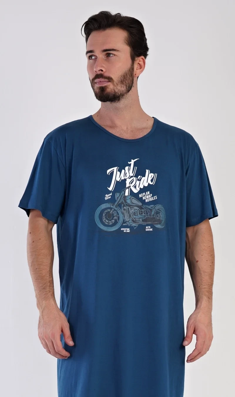 Pánská bavlněná noční košile s krátkým rukávem Samuel. Jednobarevná pánská noční košile s kulatým výstřihem je zdobena větším obrázkem motorky a nápisem JUST RIDE. Tato košile je vhodným dárkem pro všechny milovníky motorek. Použitý materiál je příjemný a poddajný na dotek. Obsah bavlny je 100%.
