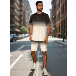 Dvoudílná pánská souprava, která se skvěle hodí na každodenní nošení, obsahuje tričko s krátkým rukávem a kulatým výstřihem a rovně střižené šortky. Oba kousky zdobí ombré efekt, který přechází z tmavších tónů do světlejších. Na tričku je vyražený nápis "LOS ANGELES", zatímco šortky mají elastický pás se stahovací šňůrkou a dvě přední kapsy.