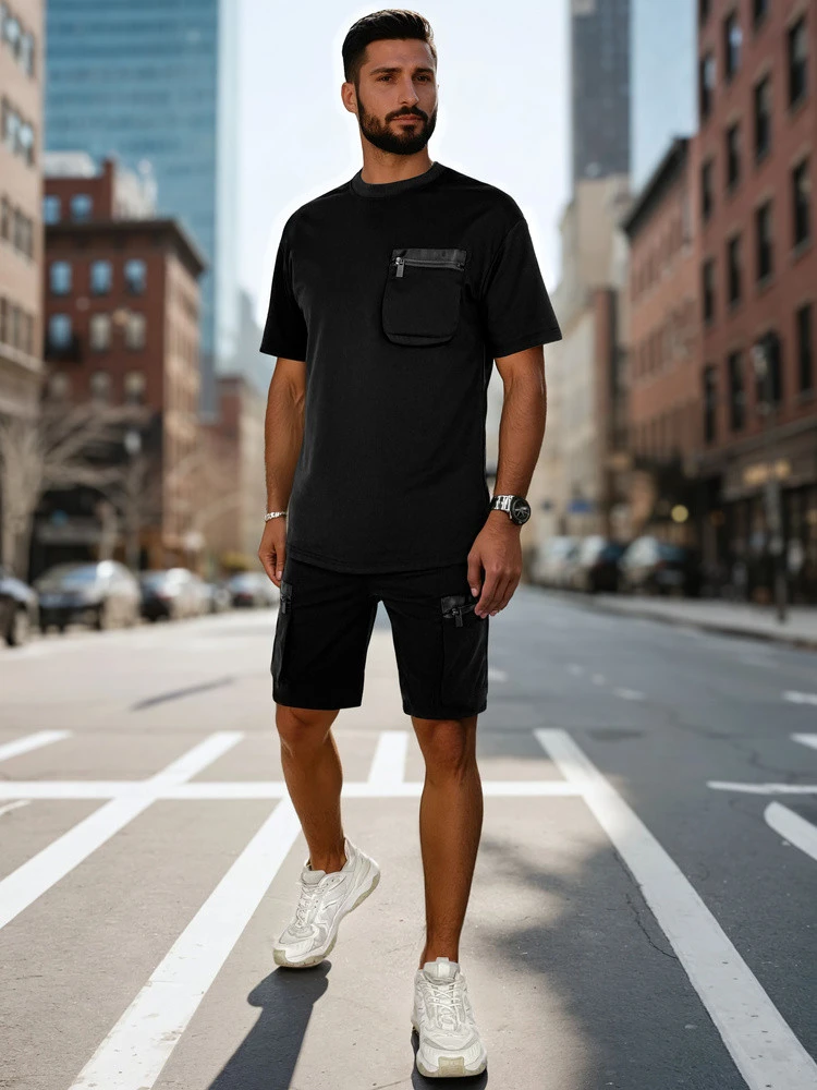 Tato dvoudílná pánská tepláková souprava je módní volbou. Tričko s krátkým rukávem má ozdobnou náprsní kapsu na zip, zaoblený výstřih a střih na míru pro celodenní pohodlí, zatímco cargo šortky mají čtyři kapsy, měkkou šňůrku v pase a nastavitelnou šňůrku. To vše v příjemném materiálu, který je ideální pro jarní dny, ať už jste ve městě nebo aktivní.