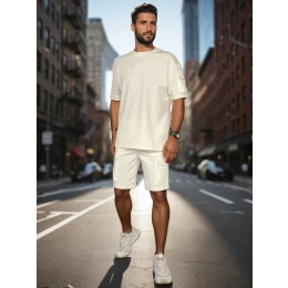Pánská tepláková souprava kombinuje pohodlí s módním městským stylem. Tričko s krátkým rukávem má ozdobnou kapsu na rameni, zatímco cargo šortky mají až čtyři kapsy a elastický pas s nastavitelnou šňůrkou. Celá souprava je vyrobena z měkké tkaniny, která je ideální pro jarní dny a každodenní městské aktivity.