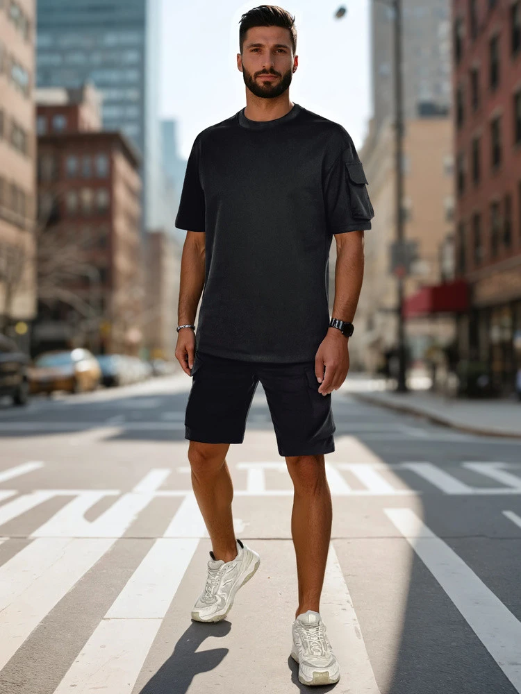 Pánská tepláková souprava kombinuje pohodlí s módním městským stylem. Tričko s krátkým rukávem má ozdobnou kapsu na rameni, zatímco cargo šortky mají až čtyři kapsy a elastický pas s nastavitelnou šňůrkou. Celá souprava je vyrobena z měkké tkaniny, která je ideální pro jarní dny a každodenní městské aktivity.
