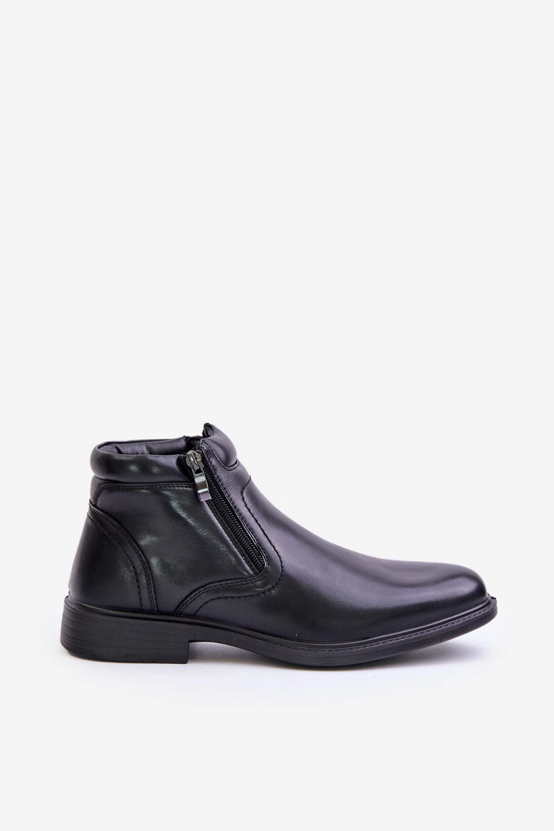 Pánské boty vyrobené z eko kůže, usazené na nízkém podpatku, jsou praktickou nabídkou na chladnější dny. Model se zapínáním na dvojitý zip usnadňuje rychlé obouvání a vyzouvání. Vnitřek je zateplený obuvnickou vlnou, což zajišťuje tepelný komfort a činí je ideální volbou na zimu. Vynikající pro každodenní, neformální stylizace. Při výběru velikosti se řiďte tabulkou velikostí.