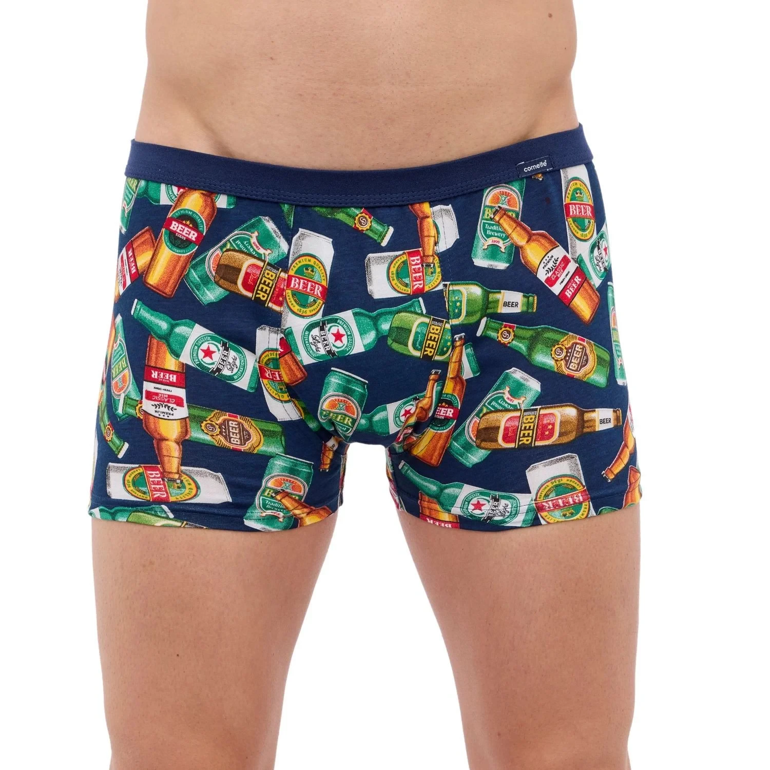 Pánské boxerky 280/236 Tatoo Bottles CORNETTE - tmavě modrá barva - z vysoce jakostní bavlny - ozdobené barevným zábavným potiskem - guma s plochým švem - obšitá bavlnou - lem nohaviček netlačí do stehen, proto jsou boxerky při nošení pohodlné a komfortní