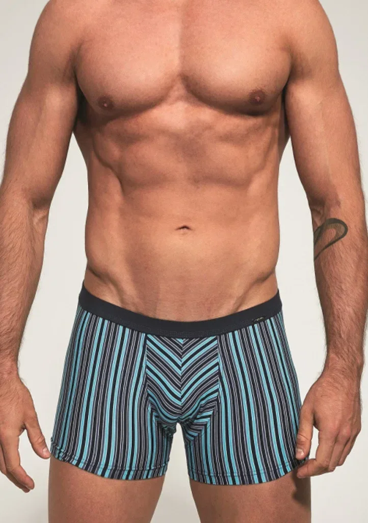 Pánské boxerky s delší nohavičkou v pruhovaném dezénu. Boxerky jsou vypasované, mají ploché švy a v pase pohodlnou gumu v tunýlku. Nohavice netlačí do stehen.