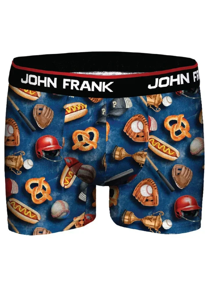 Pánské boxerky značky John Frank s vysokým podílem bavlny. Boxerky jsou velmi příjemné na dotek a pohodlné při nošení. Jsou v modré barvě, s motivem baseballu. V pase mají pohodlnou širší pružnou gumu s logem značky po obvodu. Boxerky jsou v dárkové krabičče.
