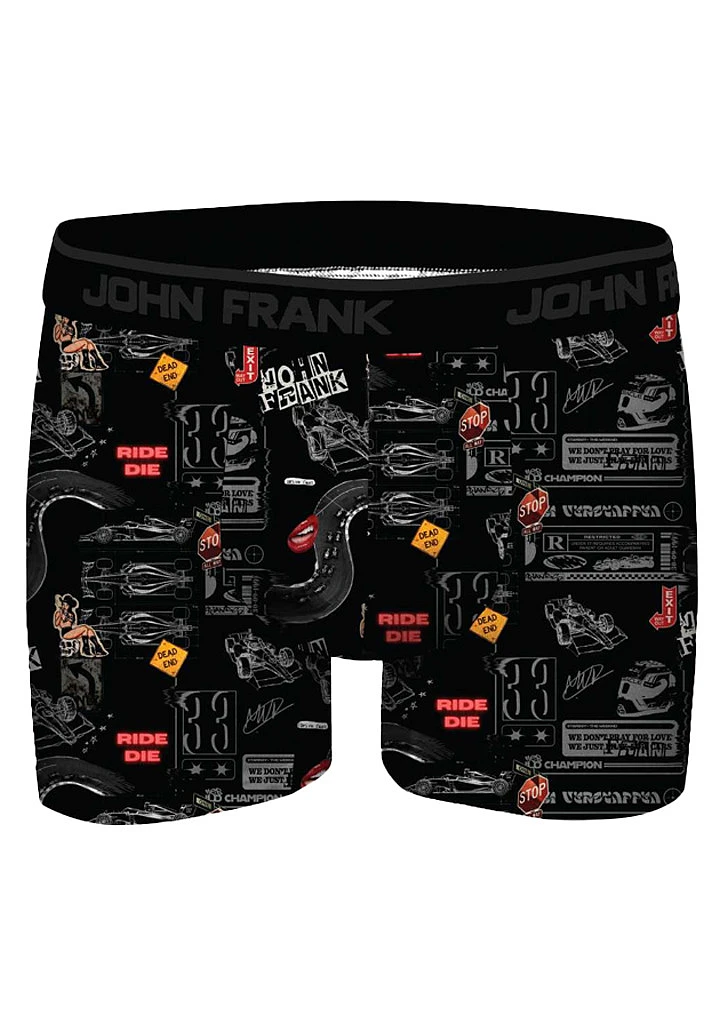 Pánské boxerky John Frank z prémiového micro modalu zaujmou originálním potiskem inspirovaným motorsportem, doplněným o nápisy a výrazné grafické prvky v černo-červeném stylu. Micro modal je mimořádně jemný, lehký a hebký materiál, který je velmi příjemný na dotek, skvěle prodyšný a efektivně odvádí vlhkost, takže zajišťuje maximální komfort po celý den. Boxerky mají pružný pas s logem značky John Frank, který dobře drží, nezařezává se a perfektně se přizpůsobí postavě. Díky elastickému složení materiálu boxerky skvěle sedí, drží tvar a neomezují v pohybu, což z nich dělá ideální volbu pro každodenní nošení.