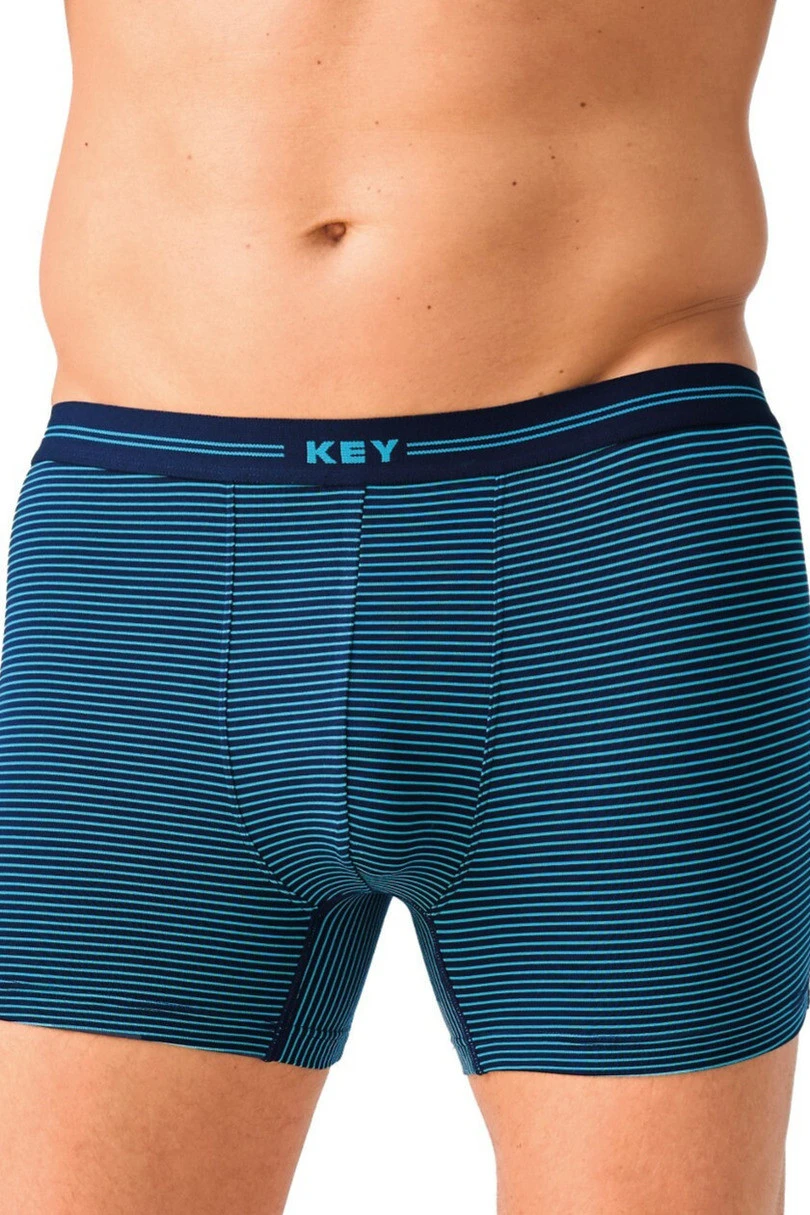 Bokserki męskie KEY w paski to połączenie sportowego designu i naturalnego komfortu. Wykonane z wysokiej jakości dzianiny bambusowej (95% bambus, 5% elastan), są wyjątkowo miękkie, przewiewne i przyjazne dla skóry. Włókno bambusowe charakteryzuje się właściwościami oddychającymi oraz antybakteryjnymi, co pomaga utrzymać uczucie świeżości przez cały dzień. Dodatek elastanu zapewnia elastyczność, idealne dopasowanie do sylwetki oraz trwałość materiału.Fason z krótką nogawką dobrze przylega do ciała, nie roluje się i gwarantuje swobodę ruchów. Szeroka, elastyczna guma z logo KEY stabilnie utrzymuje bieliznę w pasie bez nadmiernego ucisku. Granatowa baza z turkusowymi paskami nadaje modelowi nowoczesny, dynamiczny charakter.To doskonały wybór dla mężczyzn ceniących wygodę, naturalne materiały i stylowy wygląd.