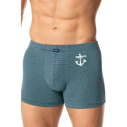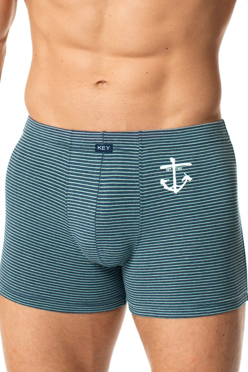 Pohodlné boxerky KEY kombinují klasický střih s módním námořnickým designem z měkké pruhované látky se stylovým potiskem kotvy na nohavičce.