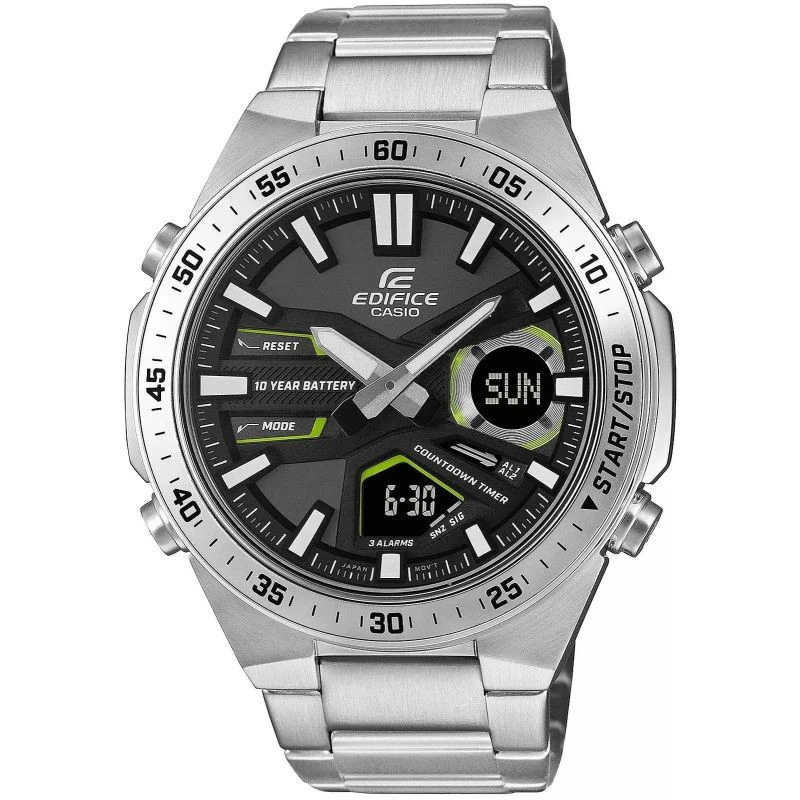 Všestranné hodinkypro aktivní a náročné. Analogově-digitální hodinky EDIFICE EFV-C110 poskytují přesnost a funkčnost po dlouhá léta - díky desetileté baterii můžete na dlouhou dobu zapomenout na jejich výměnu. Dynamický, sportovní design podtrhuje hloubka a trojrozměrnost ciferníku, zatímco digitální displeje nabízejí širokou škálu funkcí, včetně světového času, stopek na 1/100 sekundy a odpočítávacího časovače. Model je také vybaven funkcíTelememos možností uložení 30 telefonníchčísel obsahujících až 12 číslic se jménem o délce až 8 znaků. Soustřeďte se na život a vyberte si hodinky EDIFICE EFV-C110 - hodinky, které vás nezklamou.