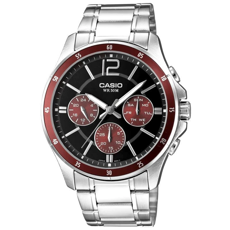 CASIO MTP-1374D-5AVDF to coś więcej niż zwykły zegarek – to niezawodny partner dla mężczyzny, który chce wyglądać stylowo w każdej sytuacji. Elegancka forma z nutą sportowego charakteru sprawia, że świetnie odnajduje się zarówno przy koszuli, jak i przy codziennym T-shircie. Czarna tarcza z srebrno czerwonymi akcentami przyciąga spojrzenia, a stalowa koperta i bransoleta z powłoką jonową (ion plated) zapewniają trwałość i odporność na zarysowania. Praktyczne subtarcze – dzień, data i czas 24-godzinny – pozwalają mieć wszystko pod kontrolą jednym rzutem oka. Dokładny mechanizm (±20 sekund/miesiąc) i wodoszczelność do 50 metrów sprawiają, że możesz go nosić bez obaw – w pracy, w podróży, nawet w deszczu. To klasyczny metalowy zegarek analogowy, który nie tylko wygląda dobrze, ale też działa wtedy, gdy go potrzebujesz.