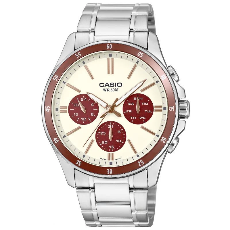 CASIO MTP-1374D-5A2VDFtocoś więcej niż zwykły zegarek – to niezawodny partner dla mężczyzny, który chce wyglądać stylowo w każdej sytuacji. Elegancka forma z nutą sportowego charakteru sprawia, że świetnie odnajduje się zarówno przy koszuli, jak i przy codziennym T-shircie. Wyrazisty kontrast tarczy przyciąga wzrok i podkreśla precyzyjne detale, a stalowa koperta i bransoleta z powłoką jonową (ion plated) zapewniają trwałość i odporność na zarysowania. Praktyczne subtarcze – dzień, data i czas 24-godzinny – pozwalają mieć wszystko pod kontrolą jednym rzutem oka. Dokładny mechanizm (±20 sekund/miesiąc) i wodoszczelność do 50 metrów sprawiają, że możesz go nosić bez obaw – w pracy, w podróży, nawet w deszczu. To klasyczny metalowy zegarek analogowy, który nie tylko wygląda dobrze, ale też działa wtedy, gdy go potrzebujesz.