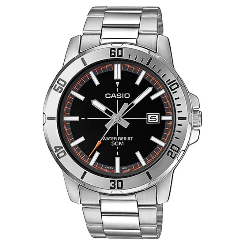 Klasický model CASIO, který vyniká robustním 44milimetrovým pouzdrem z nerezové oceli a černým ciferníkem s dynamickými oranžovými akcenty, které mu dodávají energický, mužný charakter.Přehledné indexy a pevné ručičky zajišťují dokonalou čitelnost v každé situaci - od ranního běhu až po pozdní obchodní schůzku.Praktická datumovka na 3. hodině a vodotěsnost 50M činí z těchto hodinek ideální volbu pro každý den - bez ohledu na počasí a životní styl.Díky ocelovému náramku s klasickým trojitým zapínáním spojuje tento model eleganci s každodenní funkčností.Hodinky poháněné přesným quartzovým strojkem jsou vhodné pro muže, kteří oceňují praktičnost, odolnost a moderní vzhled.