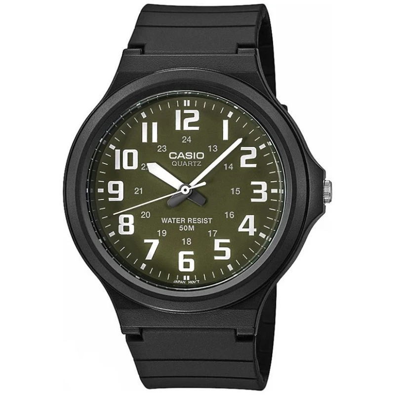 Pánský model hodinek CASIO MW-240 kombinuje minimalismus, funkčnost a pohodlí v mužném designu. Díky lehké konstrukci hodinek (pouhých 35 g!) jsou na zápěstí téměř nepostřehnutelné. Pružný matný řemínek z pryskyřice se přizpůsobí vašim pohybům, je odolný proti opotřebení a připravený na každou situaci - od schůzky až po trénink. Velké kontrastní indexy umožňují okamžitou kontrolu času. Odolné sklíčko z pryskyřice zaručuje odolnost proti každodennímu opotřebení a vodotěsnost 5 BAR zajistí, že stříkající voda, déšť ani rychlá sprcha nebudou problém.