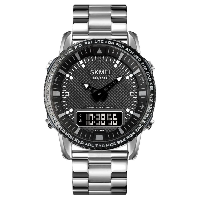 Hodinky Skmei 1898 mají jedinečný okraj ciferníku, který vyniká vyrytými zkratkami měst a časových pásem z celého světa. zkratky jako LON (Londýn), PAR (Paříž), NYC (New York), HKG (Hongkong) nebo SYD (Sydney) umožňují nositeli rychlou orientaci v různých časových pásmech, což je užitečné pro muže, který často cestuje nebo spravuje čas na mezinárodní úrovni. nejde jen o funkční detail, ale také o designový prvek, který hodinkám dodává globální, profesionální nádech.