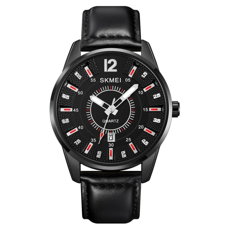 Ciferník Skmei 1993BK je promyšlený a plný detailů, které dohromady vytvářejí stylový a zároveň dynamický design - ideální pro muže, kteří ocení eleganci i funkčnost. Červené detaily na indexech a kolem středového kruhu dotvářejí celkový vzhled a vnášejí do něj nádech sportovnosti. Je to kontrast, který upoutá pozornost a díky kterému si snadno všimnete každého prvku ciferníku.