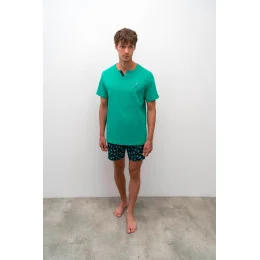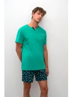 Pánské krátké pyžamo, vrchí díl jednobarevný, u krku knoflí, spodní díl barevný s potiskem kaktusů.