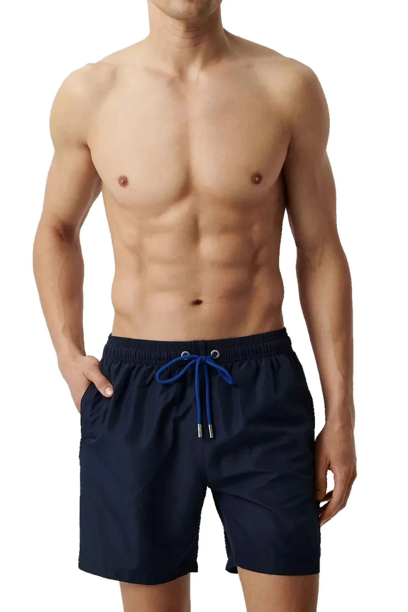 Pánské plavky 223 dark blue Atlantic - tmavě modrá barva - v pase šňůrky k zavazování kontrastní barvy - na bocích kapsy - rychleschnoucí materiál