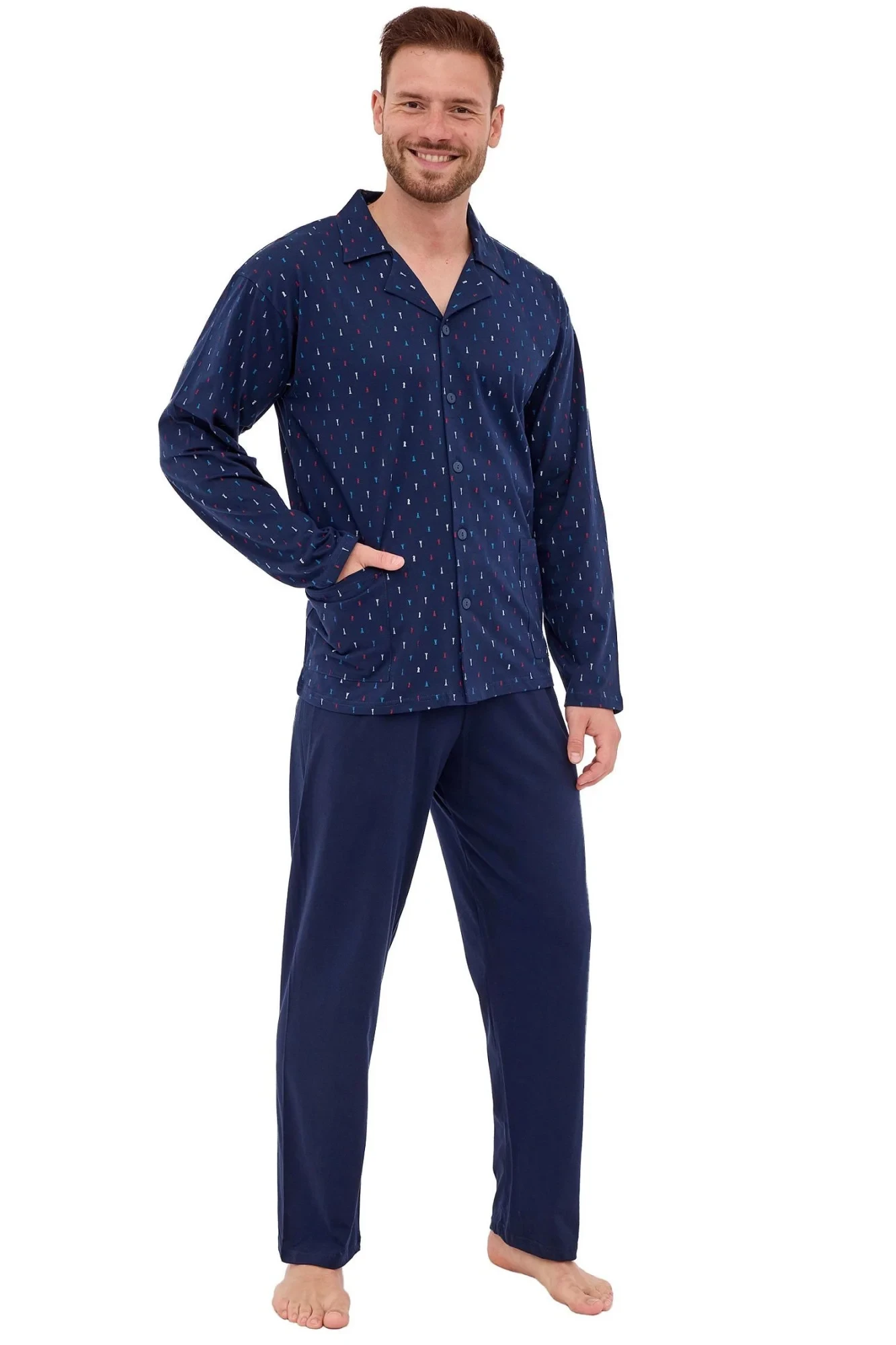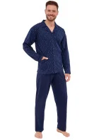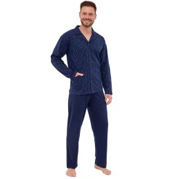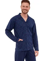 Pánské pyžamo 114/71 plus CORNETTE - z vysoce jakostní bavlny - tmavě modrá vzorovaná košile s dlouhými rukávy a kapsami - s límečkem - zapínání na knoflíky - pohodlné jednobarevné dlouhé kalhoty