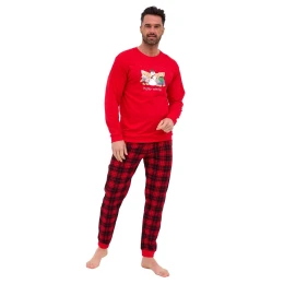 Pánské pyžamo 115/289 Winter CORNETTE - z vysoce jakostní bavlny - červené tričko s dlouhými rukávy - kulatý výstřih - přední strana ozdobená potiskem - dlouhé kárované nohavice zakončené stahovacím lemem