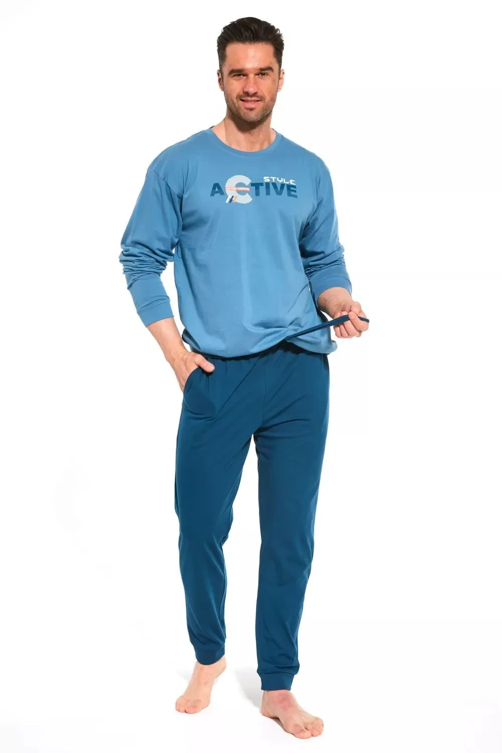 Pánské pyžamo 322/205 Active CORNETTE - z vysoce jakostní bavlny - světle modré tričko s dlouhými rukávy - na přední straně ozdobené potiskem - pohodlné dlouhé jednobarevné kalhoty