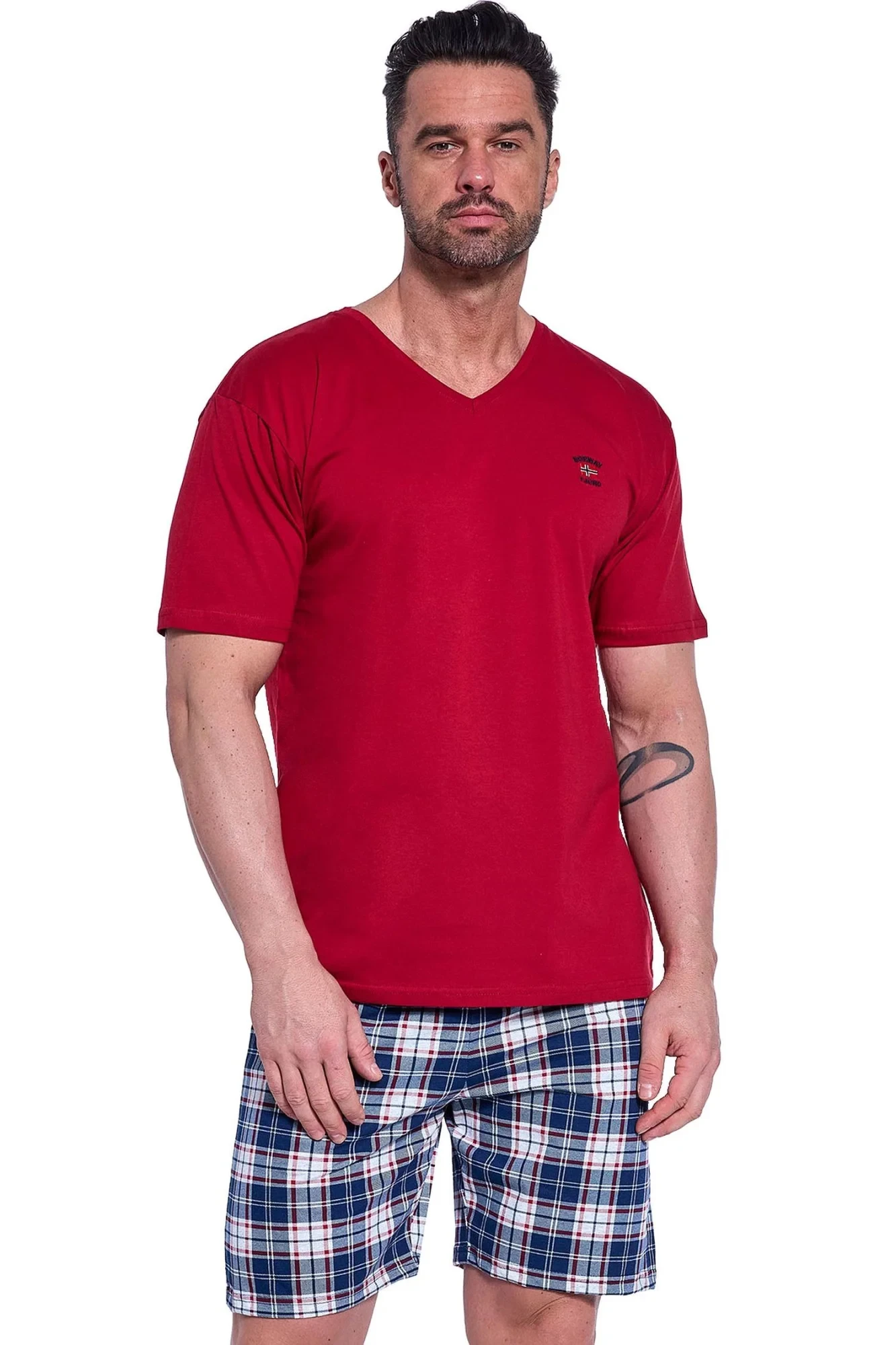 Pánské pyžamo 326/180 Norway CORNETTE - z vysoce jakostní bavlny - vínové tričko s krátkými rukávy - půlkulatý výstřih - ozdobené potiskem na přední straně - kárované kraťasy