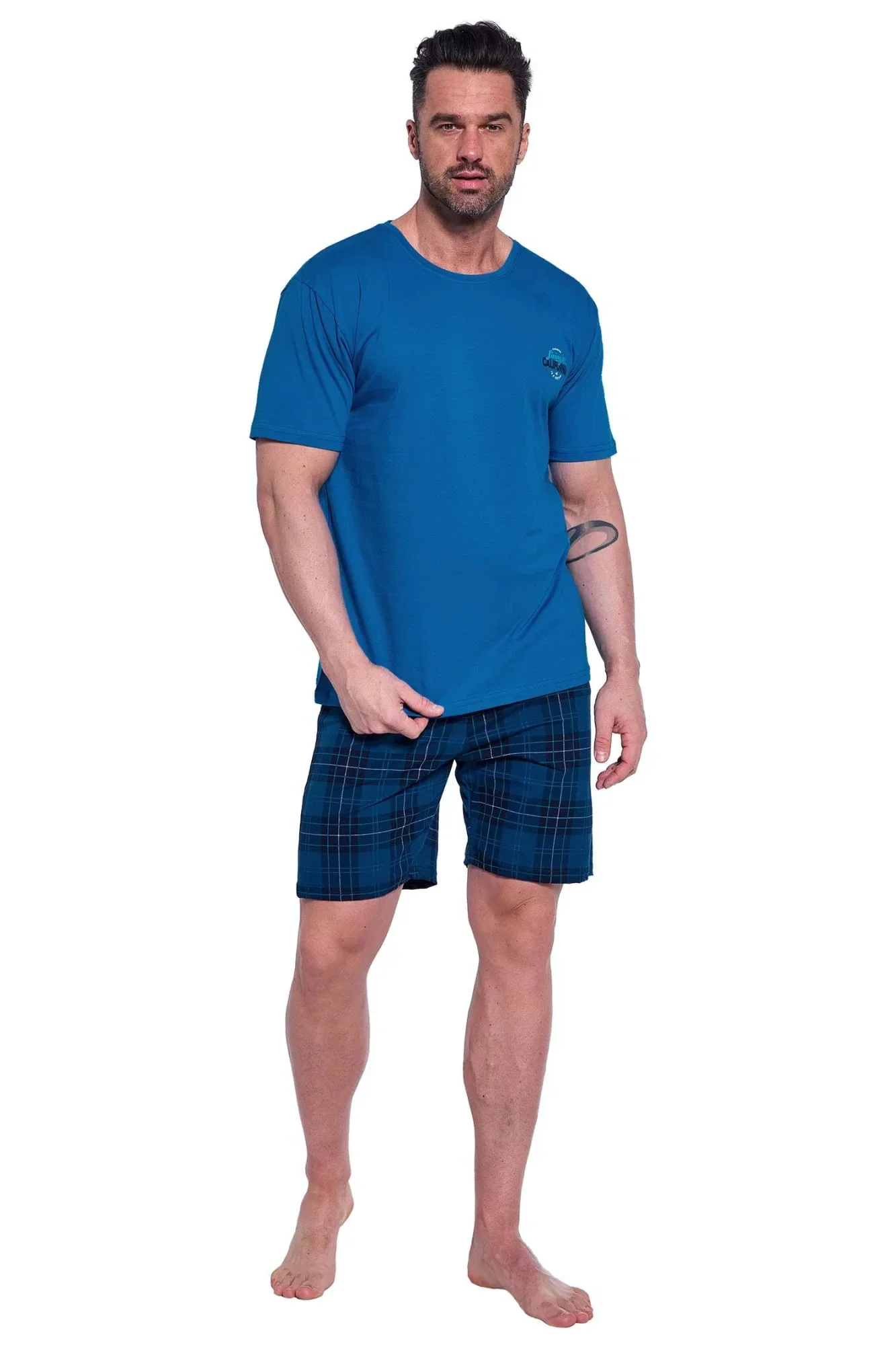 Pánské pyžamo 326/186 California CORNETTE - z vysoce jakostní bavlny - světle modré tričko s krátkými rukávy - půlkulatý výstřih - ozdobené potiskem na přední straně - kárované kraťasy