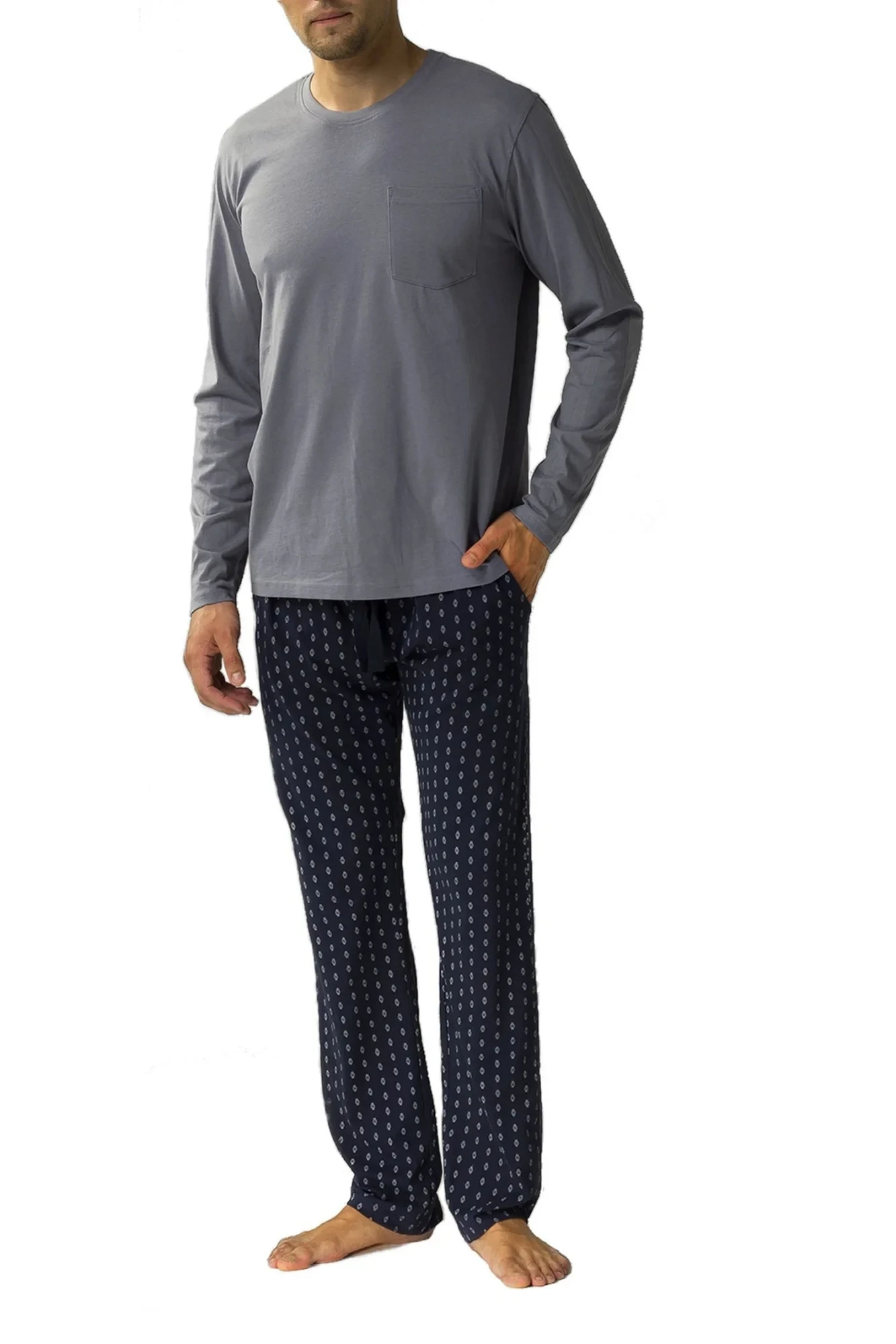 Pánské pyžamo 373 Atlantic - z vysoce jakostní bavlny - šedé tričko s dlouhými rukávy - na přední straně kapsička - dlouhé modré vzorované kalhoty s kapsami - nastavitelná šňůrka v pase