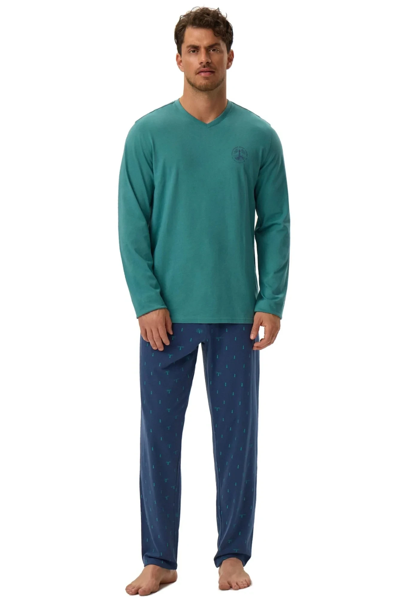 Pánské pyžamo 41906 Joger green HENDERSON - z vysoce jakostní bavlny - tričko zelené barvy s dlouhými rukávy - na přední straně zdobené potiskem - dlouhé vzorované kalhoty