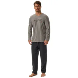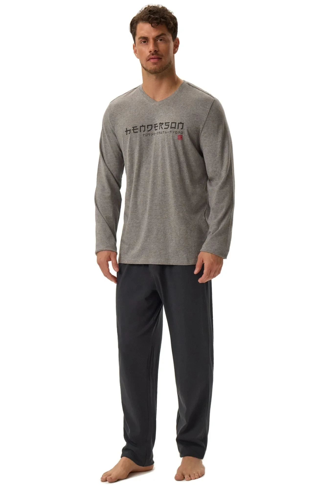 Pánské pyžamo 41911 Japan HENDERSON - z vysoce jakostní bavlny - tričko šedé barvy s dlouhými rukávy - na přední straně ozdobené potiskem - dlouhé jednobarevné kalhoty